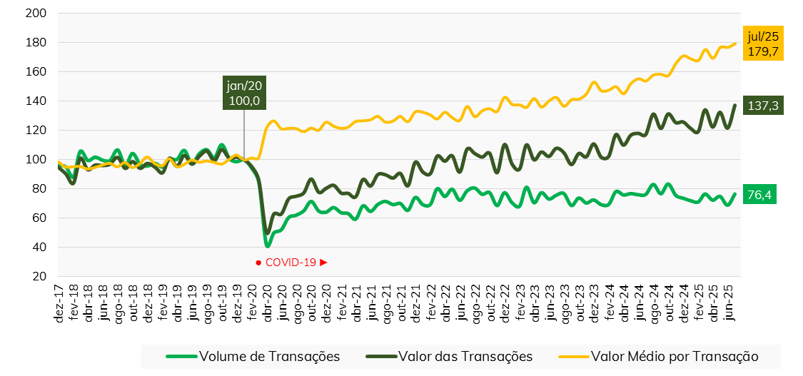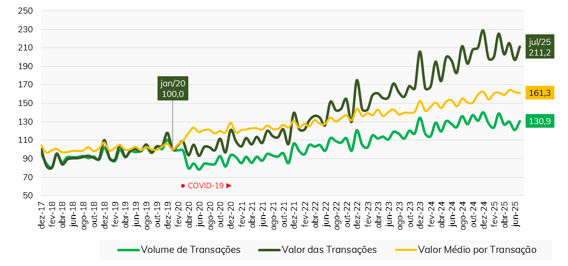 - Na comparação entre julho de 2024 e julho de 2025, por sua vez, observou-se uma elevação de 5,2% no volume de transações, além de uma alta de 15,5% no valor total movimentado no segmento. Esse desempenho positivo no consumo se deveu, em boa medida, ao aumento observado de 9,8% no valor médio por transação.