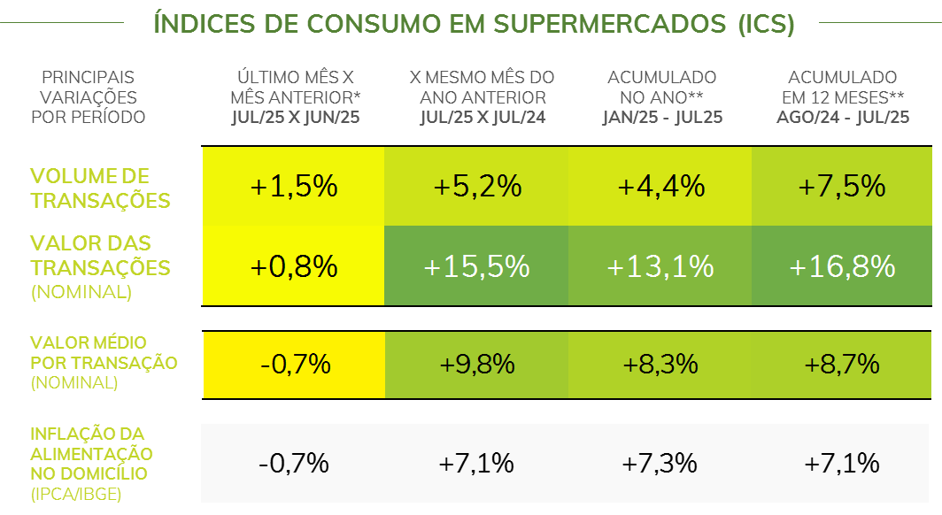 - Entre junho e julho de 2025*, os supermercados registraram um aumento de 1,5% no número de transações efetivadas, acompanhado por um incremento de 0,8% no valor total das transações nos estabelecimentos. No mesmo período, houve um recuo de 0,7% no valor médio por transação nos estabelecimentos.