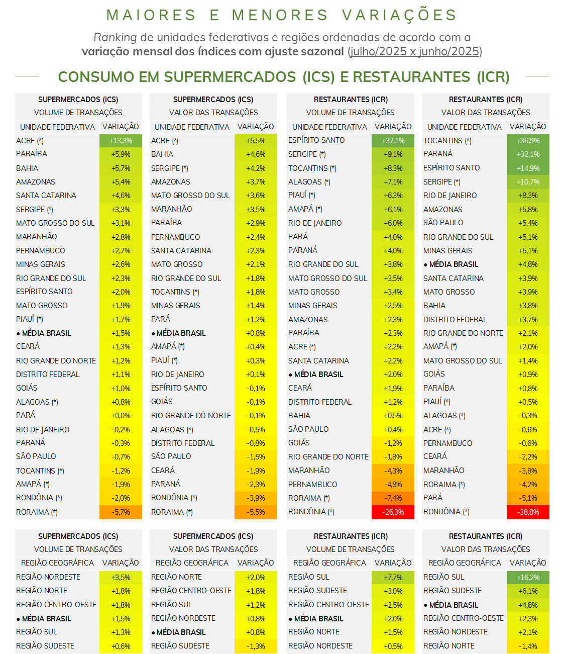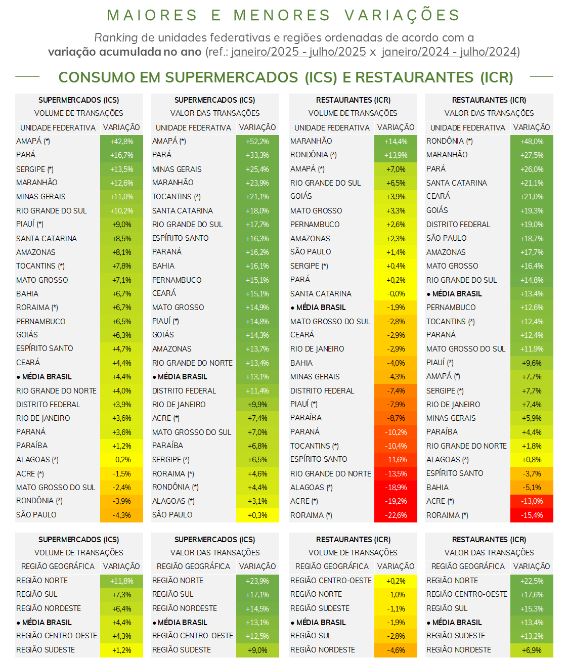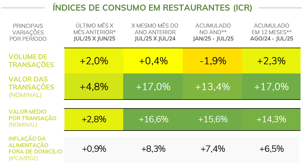 - Comparando-se junho e julho de 2025*, o número de transações em restaurantes avançou 2,0%, enquanto o valor transacionado cresceu 4,8%. O valor médio por transação contribuiu para isso, com um aumento de 2,8%.