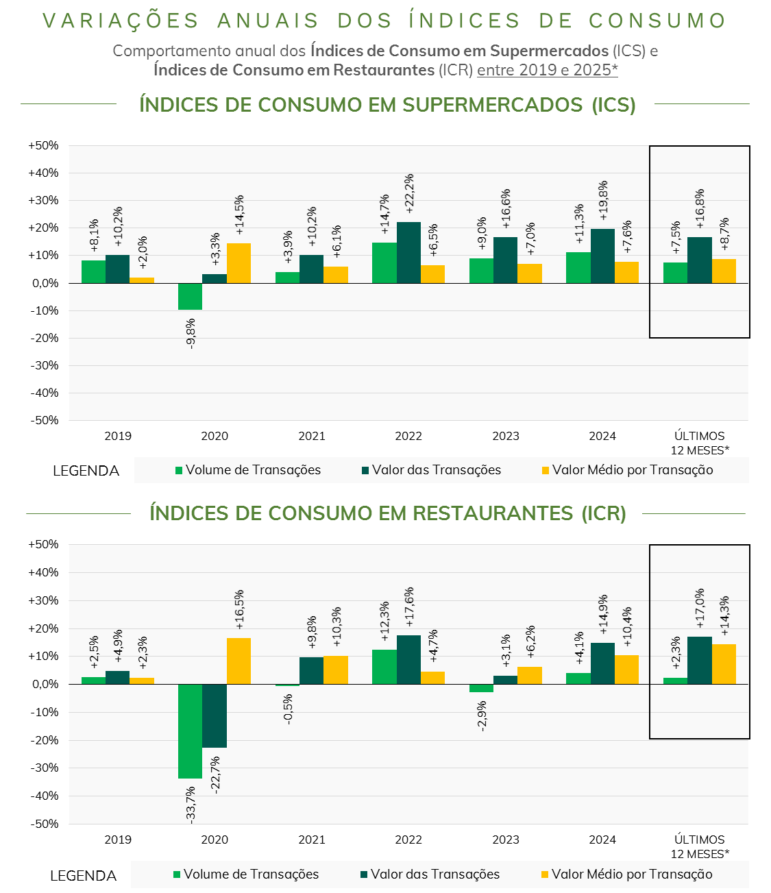- Considerando os últimos 12 meses**, o volume de transações foi 7,5% superior ao registrado no período anterior, enquanto o valor transacionado cresceu 16,8%, também apoiado no valor médio por transação (+8,7%).