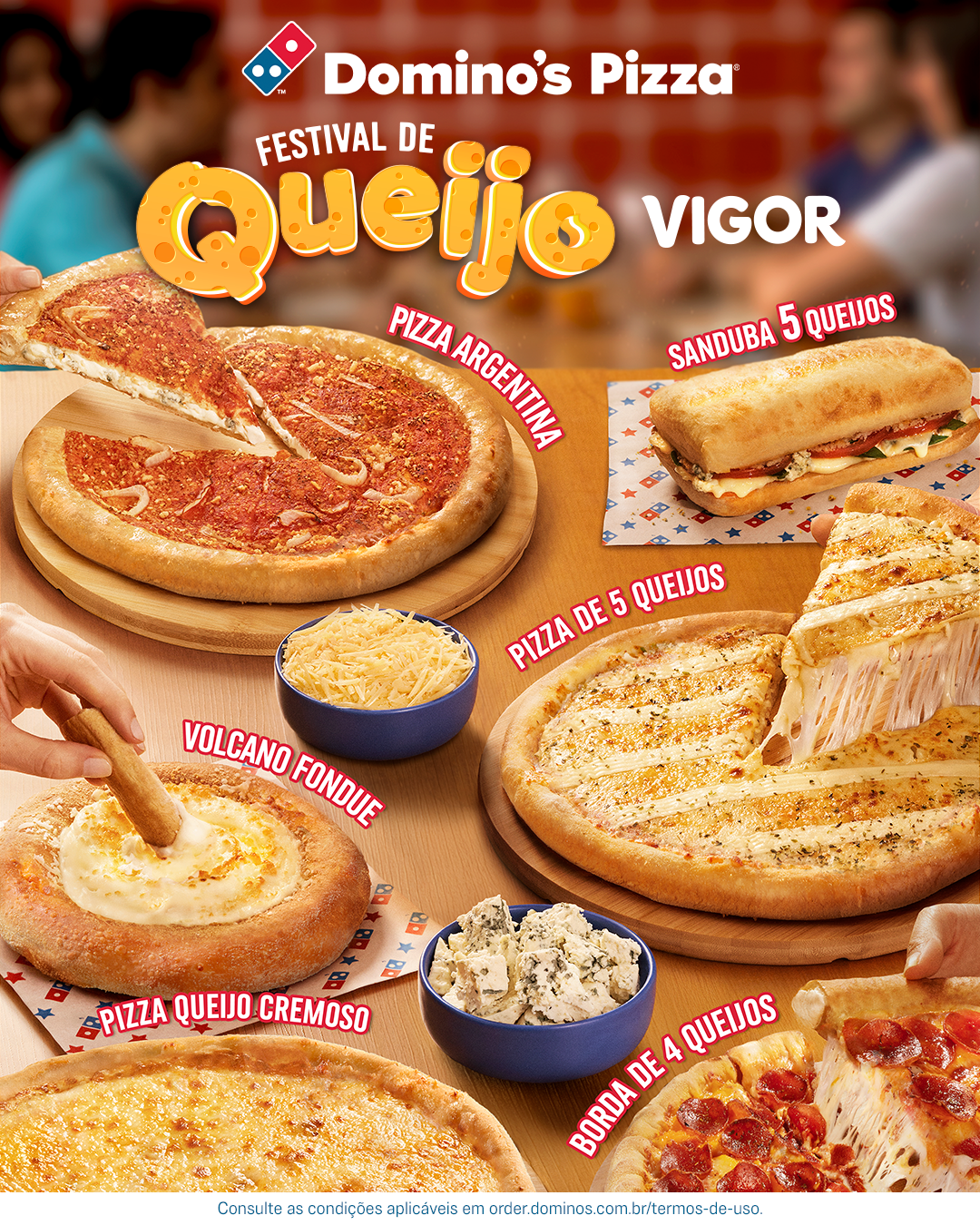 “Depois do sucesso dos festivais de Cheddar e Pepperoni, chegou a vez de fazer uma homenagem a um ingrediente que é paixão nacional: o queijo. Unimos nosso time de produto e desenvolvimento com a Vigor, uma grande parceira, para criar receitas de qualidade e com texturas envolventes. Como destacamos na campanha, é uma experiência gastronômica pensada para quem a paixão por queijo é infinita”, brinca Gabriel Ferrari, CMO da Domino’s Pizza Brasil.