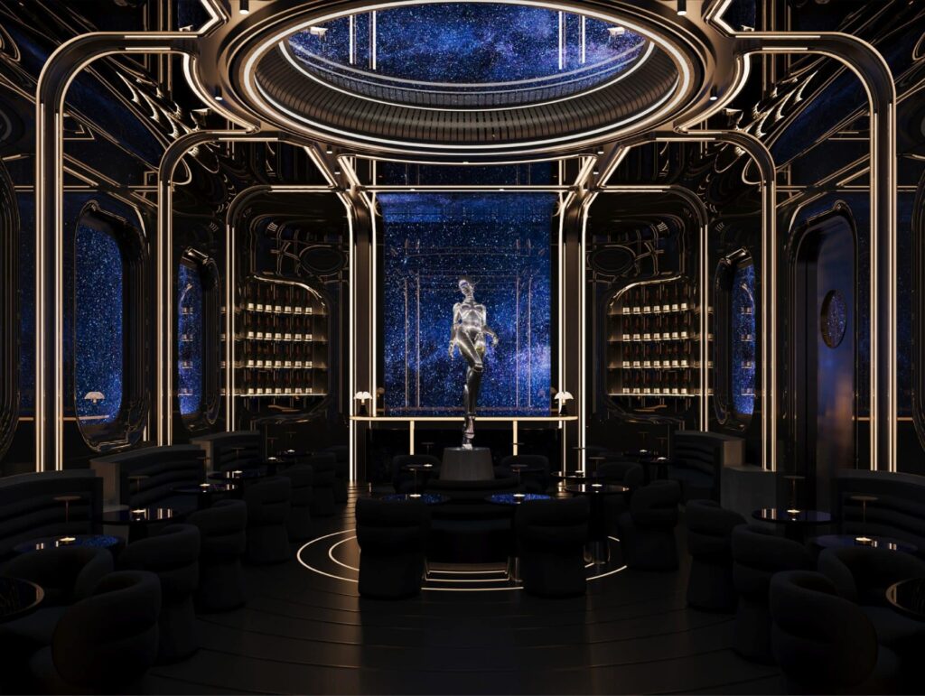 O espaço físico acompanha a proposta inovadora. O restaurante aposta em arquitetura futurista, arte interativa e iluminação inteligente para criar um ambiente totalmente imersivo. Um dos destaques é o lounge secreto “Spock”, onde os visitantes embarcam em uma jornada sensorial que simula uma viagem espacial. Tecnologia, arte e gastronomia se unem para oferecer uma vivência completa.