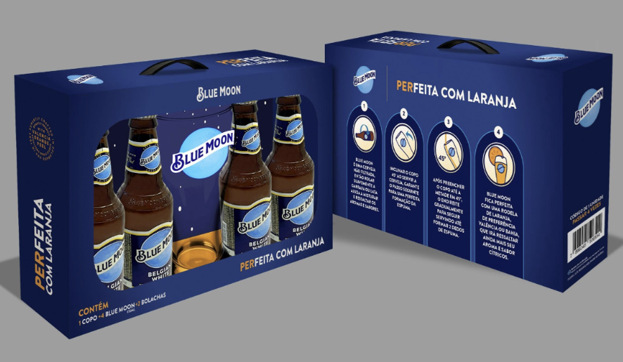Pela primeira vez no Brasil, a Blue Moon apresenta aos consumidores o gift pack “PERFEITA COM LARANJA”. O kit, limitado, inclui unidades da cerveja long necks, porta-copo e um copo oficial da marca. A edição já está disponível em pontos de venda físicos e no e-commerce com