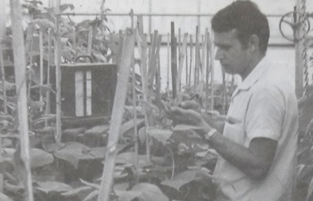 Legenda: Engenheiro Agrônomo e pesquisador-científico Luiz D’Artagnan de Almeida, do Instituto Agronômico – IAC, trabalhando com feijão em Casa de Vegetação nos anos 1960. |