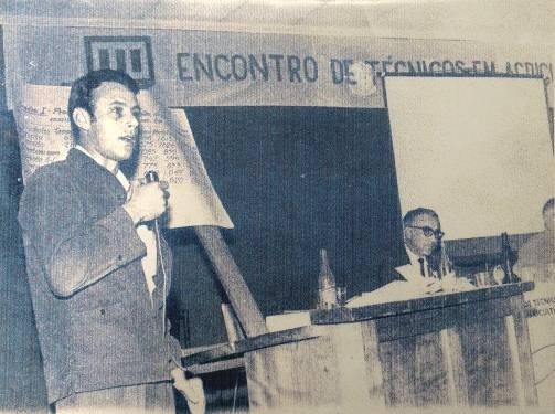 Engenheiro-agrônomo Luiz D’Artagnan de Almeida apresentando o primeiro relato sobre o feijão ‘Carioca’, no 3º Encontro de Técnicos em Agricultura, em agosto de 1968, em Serra Negra, SP. |
