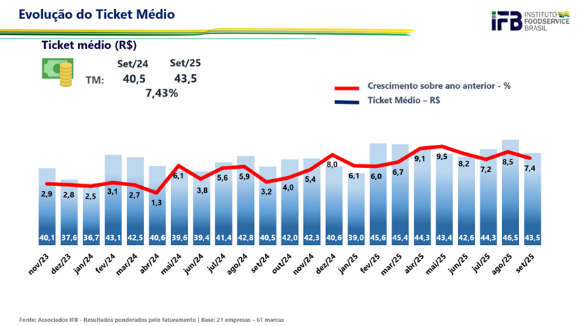Em setembro, o número de transações — ou seja, o volume de pedidos — apresentou queda de 1,6% em relação a 2024. Já o ticket médio das redes fechou em R$ 43,50, o que representa um crescimento de 7,4% frente ao mesmo mês do ano anterior.