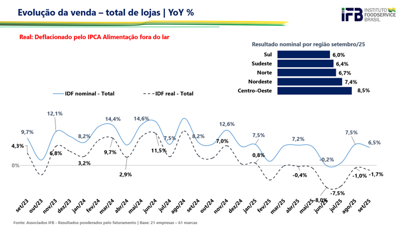 Em setembro de 2025, os principais operadores de foodservice associados ao IFB registraram um aumento nominal de 6,5% no faturamento em relação ao mesmo período de 2024. Quando considerado o crescimento real — isto é, descontados os efeitos da inflação —, observou-se uma queda de 1,7%.