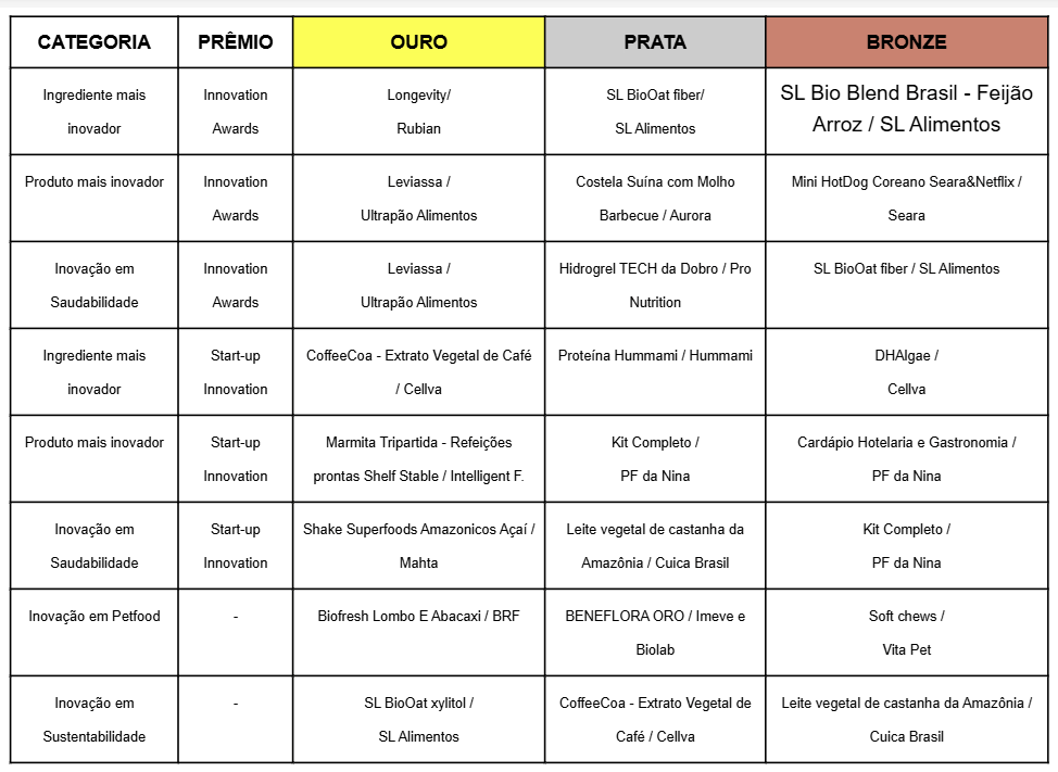 No Innovation Awards, a Rubian foi a vencedora do “Ingrediente mais inovador” com o Longevity, enquanto a SL Alimentos levou o segundo e o terceiro lugar, apresentando o SL BioOat fiber e o SL Bio Blend Brasil – Feijão Arroz, respectivamente. A Ultrapão Alimentos levou mais uma categoria, o “Produto mais inovador”, com a Levissa. A Costela Suína com Molho Barbecue, da Aurora, foi a vice, com o Mini HotDog Coreano Seara&Netflix, da Seara, fechando o pódio.