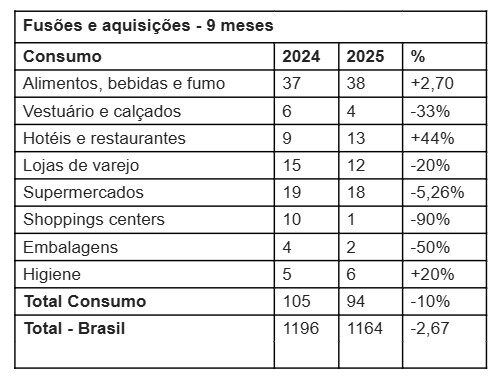 Os setores que se destacaram no acumulado dos nove meses deste ano foram os seguintes: hotéis e restaurantes, 13 (aumento de 44% em relação ao mesmo período de 2024); higiene, 6 (+20%) e de alimentos, bebidas e fumo, 38 (+2,70%). Por outro lado, na lista de áreas analisadas com redução nas operações estão: shoppings centers, com 1 transação (-90%); embalagens, 2 (-50%); vestuário e calçados, 4 (-33%); lojas de varejo, 12 (-20%) e supermercados, 18 (-5,26%).