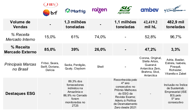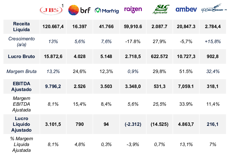 Crescimento de Receita e Dinâmica de Margens: A M. Dias Branco foi o maior destaque, com avanço expressivo de receita (+15,8%) e expansão de margem EBITDA para 11,4%. Já BRF e Marfrig (MBRF) entregaram crescimento moderado de receita (+5,6% e +7,6%), mas com forte compressão de margens devido a custos elevados, restrições de exportação e ciclo bovino desfavorável. A JBS expandiu receita globalmente (+13%), mas também enfrentou queda de margem EBITDA (8,1%). A Raízen foi o outlier negativo, com forte retração de receita (-17,8%) e prejuízo líquido expressivo.