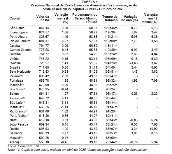 O DIEESE também analisou o comprometimento da renda. Considerando o salário mínimo líquido — já descontada a contribuição para a Previdência — o trabalhador precisou destinar, em média, 49,29% do rendimento para adquirir os alimentos básicos em outubro. O percentual é ligeiramente menor que o registrado no mesmo mês de 2024 (51,72%), mas ainda indica forte pressão no orçamento das famílias.