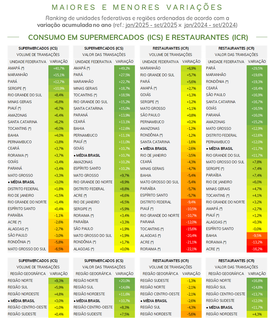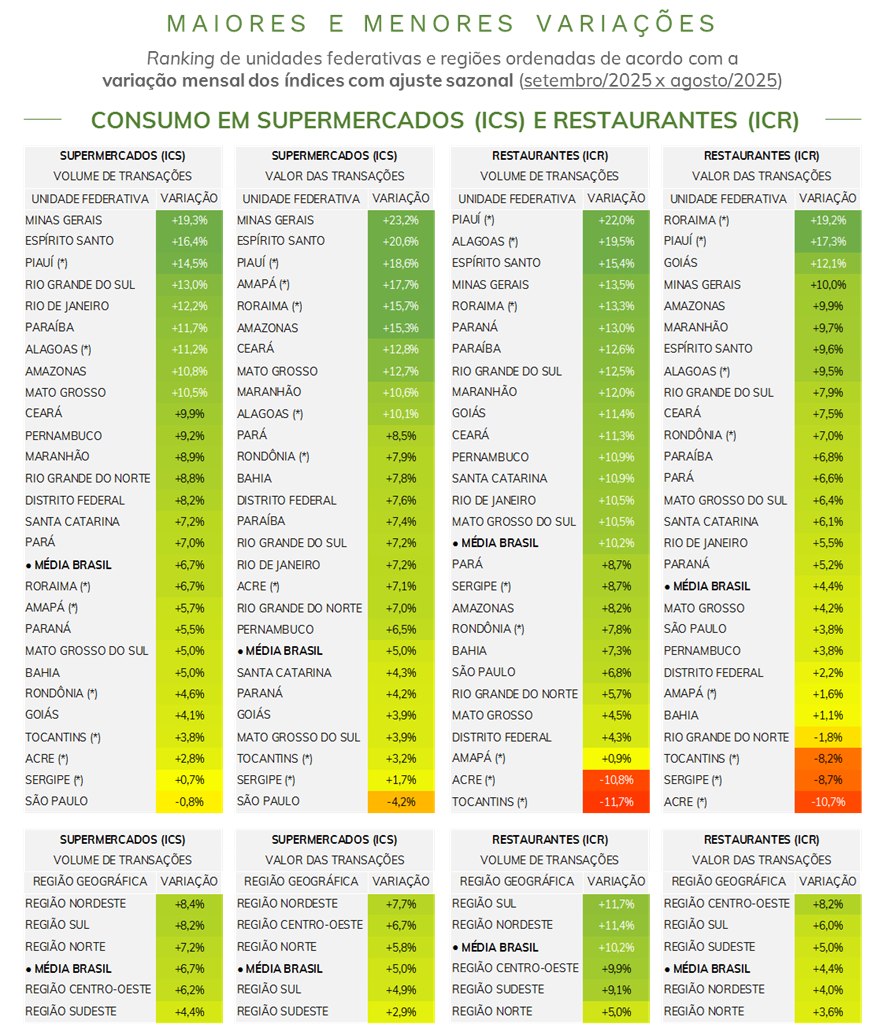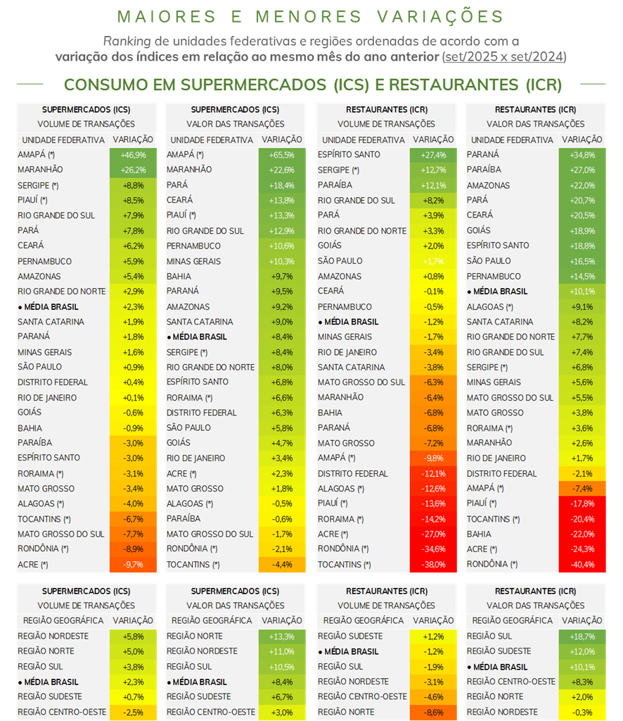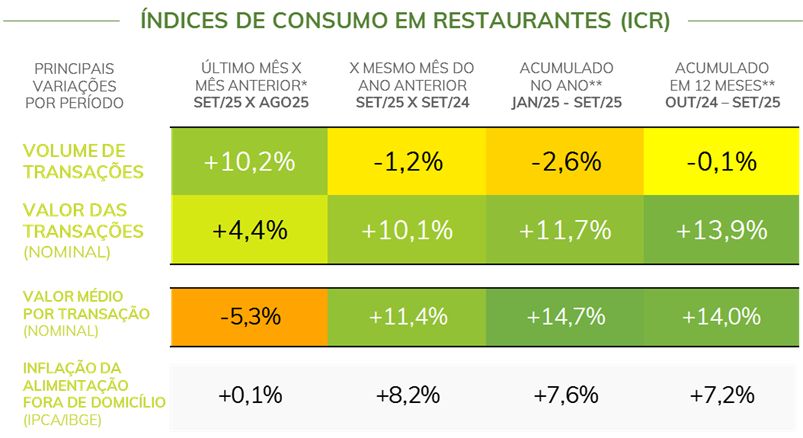 - Comparando-se agosto e setembro de 2025*, o número de transações em restaurantes registrou alta de 10,2%, em paralelo a um aumento de 4,4% no valor transacionado. O valor médio por transação teve queda de 5,3%.