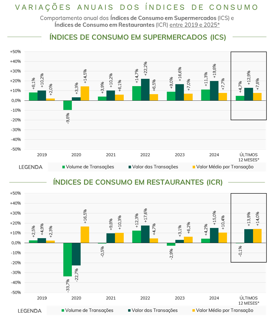 - Considerando os últimos 12 meses**, o volume de transações foi 4,7% superior ao registrado no período anterior, enquanto o valor transacionado cresceu 12,9%, também apoiado no valor médio por transação (+7,8%).