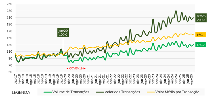 - No balanço parcial do ano até setembro**, os índices revelaram um crescimento acumulado de 3,0% no número de transações, acompanhado por expansão de 10,7% no faturamento do segmento. A alta de 7,5% do valor médio por transação também foi importante para explicar o resultado positivo ante o mesmo período de 2024.