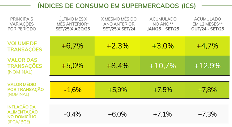 - Entre agosto e setembro de 2025*, os supermercados registraram um aumento de 6,7% no número de transações efetivadas, acompanhada por crescimento de 5,0% no valor total das transações nos estabelecimentos. Considerando o mesmo intervalo, o valor médio por transação apresentou um recuo de 1,6% no último período.