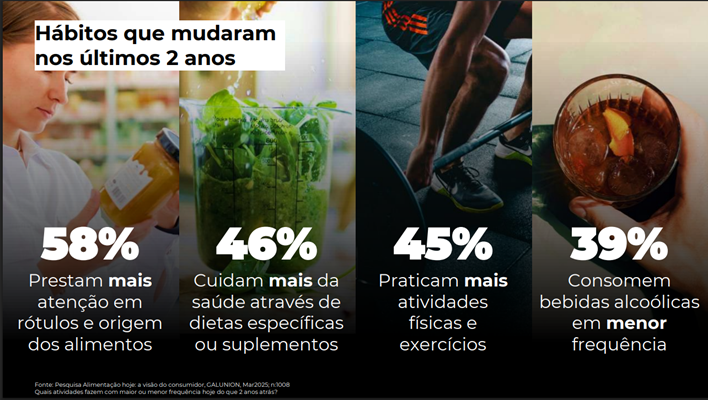 Nos últimos anos, o comportamento dos consumidores brasileiros tem passado por uma transformação cada vez mais aparente. A busca por qualidade de vida, impulsionada por uma maior conscientização sobre saúde e bem-estar, tem moldado novas escolhas na alimentação, no consumo de bebidas e na rotina de exercícios físicos. De acordo com a pesquisa “Alimentação Hoje: a visão do consumidor”, realizada pela GALUNION, foi possível verificar tais mudanças. O estudo quis entender quais atividades os consumidores fazem com maior ou menor frequência atualmente do que há dois anos. Como resultado, 46% cuidam mais da saúde por meio de dietas específicas ou suplementos, 45% praticam mais atividades físicas e exercícios e 39% consomem bebidas alcoólicas com menor regularidade.