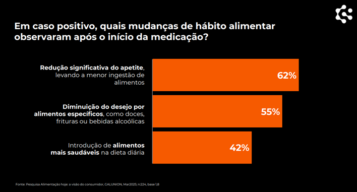 Pela primeira vez, o levantamento também quis saber se o consumidor ou alguém próximo está atualmente utilizando medicamentos para redução de peso ou apetite. Neste quesito, a pesquisa mostra que 22% conhecem ou estão usando, número que sobe para 32% na classe A. Para analisar essa questão mais a fundo, em caso positivo, houve a pergunta sobre quais mudanças de hábito alimentar foram observadas nos usuários após o início da medicação. Neste caso, 62% observaram uma redução significativa no apetite, levando a menor ingestão de alimentos, 55% diminuição do desejo por alimentos específicos, como doces, frituras ou bebidas alcoólicas, e 42% afirmaram que observaram a introdução de alimentos mais saudáveis na dieta diária.