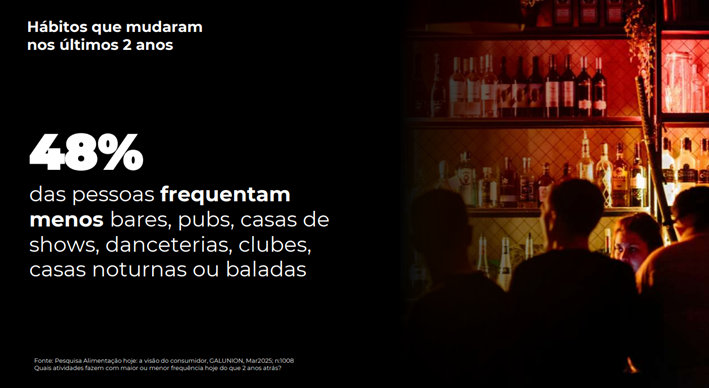 Outra mudança perceptível é a diminuição no consumo de bebidas alcoólicas. Especialmente entre os jovens adultos, há uma tendência crescente de reduzir ou até eliminar o álcool da rotina. As motivações variam desde saúde física e mental a uma importância ao estado de presença e conexão, e contenção de gastos. A indústria, atenta a esse movimento, tem investido em bebidas não alcoólicas com design e sabor sofisticados, como os chamados “mocktails” e cervejas sem álcool. “Nossa pesquisa mostra que, diante deste cenário, 48% das pessoas frequentam menos bares, pubs, casas de shows, danceterias, clubes, casas noturnas ou baladas. Vimos também um recente movimento global de experiência diurnas movidas a bebidas não alcoólicas, como as coffee parties, com festas com DJ e música, em cafeterias, que ocorrem durante o dia”, explica.