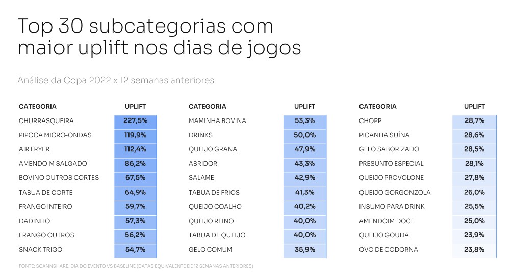 Produtos ligados a momentos de conexão, em especial os de churrasco e snacks, são os com maior pico de vendas durante campeonatos de futebol. Nos dias de jogos do Brasil na Copa de 2022, houve crescimento médio de 227% na venda de churrasqueiras, 120% em pipoca de microondas, 112% em airfryer, 86% em amendoim salgado e 67% em espetinho bovino, as cinco principais categorias influenciadas.