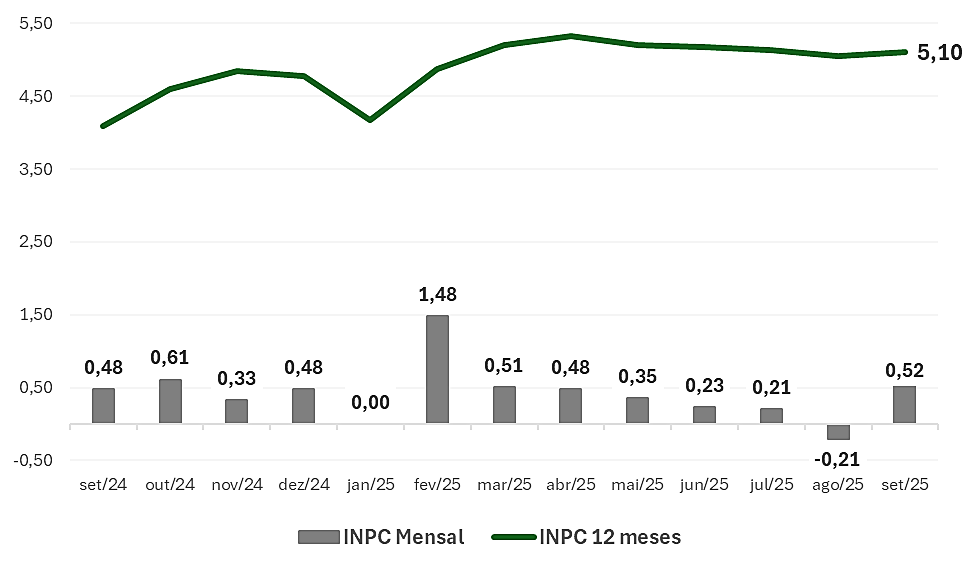 O INPC, índice que mede a inflação para famílias com renda de até cinco salários mínimos, subiu 0,52% em setembro — variação um pouco maior que a do IPCA. Isso se deve ao peso mais significativo da energia elétrica no orçamento das famílias dessa faixa de renda. O grupo Habitação teve alta de 3,28%. No acumulado do ano, o índice soma 3,62%, e em 12 meses, 5,10%.