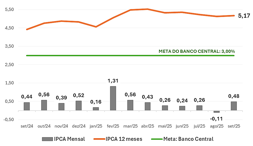 Mesmo com a alta, setembro registrou a maior variação mensal desde março, quando o IPCA havia atingido 0,56%. No acumulado de 2025, a inflação soma 3,64% e, em 12 meses, 5,17%, ligeiramente acima dos 5,13% anteriores. Apesar disso, o comportamento dos preços sinaliza uma desaceleração gradual do ritmo inflacionário.
