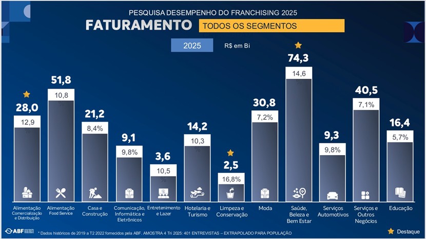 - Todos os segmentos elencados pela ABF cresceram em 2025, com destaque para Limpeza e Conservação, Saúde, Beleza e Bem-Estar, e Alimentação – Comércio e Distribuição