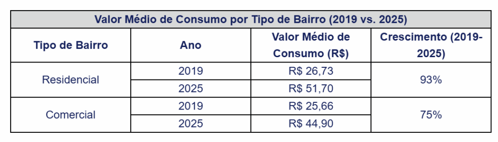 Em 2019, os bairros comerciais dominavam o cenário, concentrando quase 87% do consumo e das transações. No entanto, a pandemia de 2020 alterou esse panorama, com os bairros residenciais superando 52% do consumo e quase 49% das transações – um salto de quase 300% em relação ao ano anterior. Embora o valor médio de consumo tenha crescido em ambas as regiões, os bairros residenciais se destacaram, superando os comerciais, principalmente a partir de 2023:
