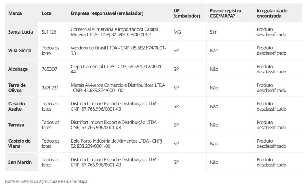 Até junho deste ano, 12 marcas de azeite de oliva haviam sido desclassificadas por fraude, e outras cinco foram proibidas de circular no Brasil. Na última sexta-feira (6), o Ministério da Agricultura e Pecuária (Mapa) e a Agência Nacional de Vigilância Sanitária (Anvisa) atualizaram a lista de produtos que devem ser retirados das prateleiras.