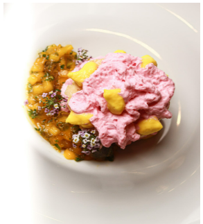 - Millefoglie con spumone alla pitaya, gelatina di grappa aromatica, mango e menta
