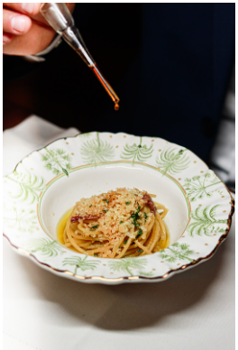 - Spaghetti con colatura di alici, aglio, olio e pane croccante