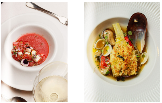 Alcachofrinhas gratinadas, servidas com creme aveludado de mexilhões e vôngoles. - Tartare di tonno bluefin con gazpacho di anguria e formaggio feta