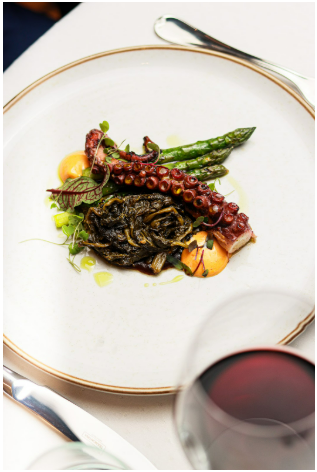 - Polpo arrosto con asparagi verdi, friarielli, marmellata di aglio nero fermentato e aioli delicato al peperone arrostito