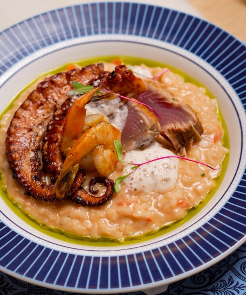 As receitas são da chef Mariana Peres, entre elas, o Trocadero (R$ 69,00) – risoto milanes com picadinho de mignon e crispy de alho poró, o Cinearte (R$ 92,00) – risoto de frutos do mar com atum selado, camarões e polvo, azeite de cebolinha e espuma do mar, e para o público vegano ou adepto de uma alimentação sem carne, o restaurante aposta em uma versão sem proteína animal, o Galeries Lafayette (R$ 59,00) – risoto de beterraba com tahine, cogumelos ao roti de legumes e sementes de girassol tostado.