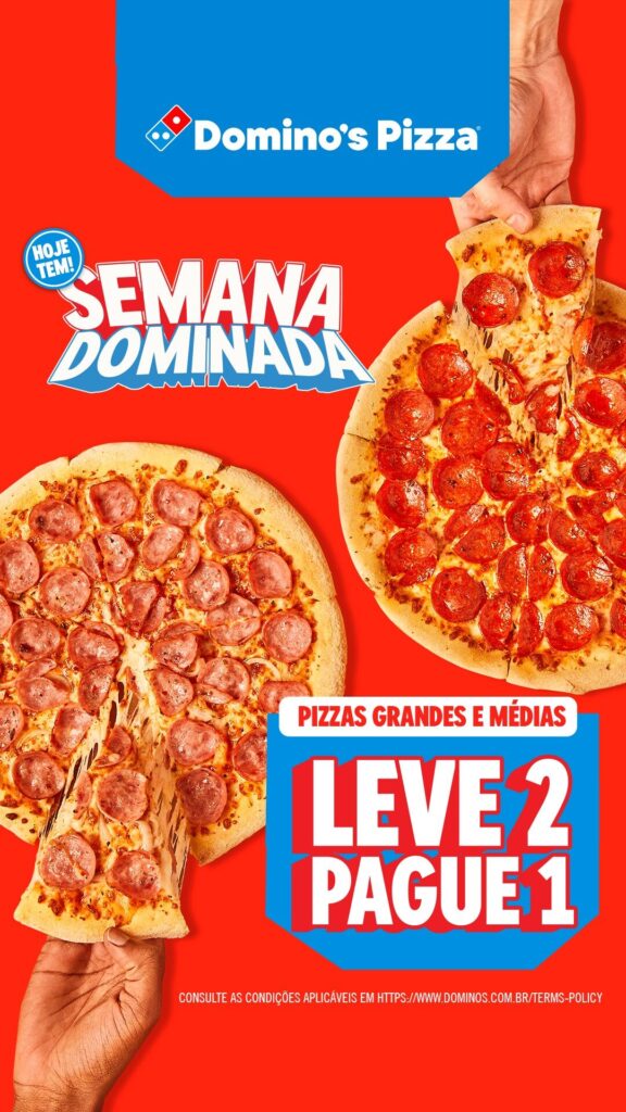 A promoção é válida em todos os canais de venda da marca: site oficial, aplicativo Domino’s Pizzas Brasil, WhatsApp, telefone ou balcão, garantindo liberdade para o consumidor escolher como, quando e onde pedir.