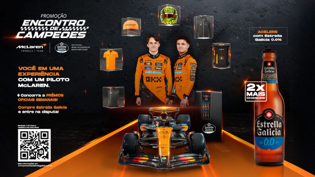 A Estrella Galicia, cervejaria espanhola independente e patrocinadora oficial da McLaren F1 Team, lançou a promoção “Encontro de Campeões”, em parceria com a Coca-Cola FEMSA Brasil. A ação, que acontece entre 1º de outubro e 15 de novembro de 2025, oferece prêmios que vão desde itens oficiais da equipe de Fórmula 1 até uma experiência VIP com os pilotos da escuderia.