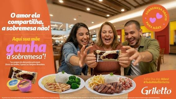 O Griletto realiza, entre a próxima segunda-feira (4) e o dia 10 de maio, uma ação especial motivada pelo Dia das Mães. Durante este período, os clientes que comprarem dois pratos das linhas Direto da Grelha, Express ou Tempero Brasileiro do cardápio da rede de grelhados do Grupo Halipar ganharão de brinde uma sobremesa. A ação será válida apenas no balcão das lojas.