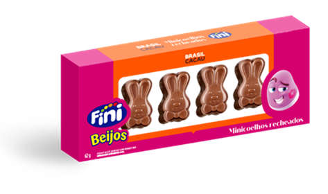 Caixa de Minicoelhos recheados Fini Beijos: Produto altamente presenteável em um molde icônico da Páscoa — o coelhinho — que reforça o apelo emocional da data e amplia as possibilidades de escolha do consumidor. Com preço de entrada, a Caixa Mini Coelhos Fini (62g) se posiciona como uma excelente oportunidade para complemento de presente, antecipação de vendas e experimentação do sabor icônico Fini Beijos.