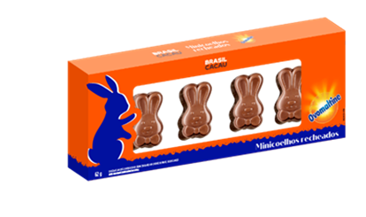 Caixa de Minicoelhos Recheados Ovomaltine: A Caixa Mini Coelho Recheado Ovomaltine (62g) traz coelhinhos de chocolate ao leite com um recheio cremoso e crocante de Ovomaltine — e agora em um molde novo, ainda mais encantador. Uma explosão de textura e sabor que vai conquistar desde a primeira mordida. Ideal para presentear ou se deliciar!