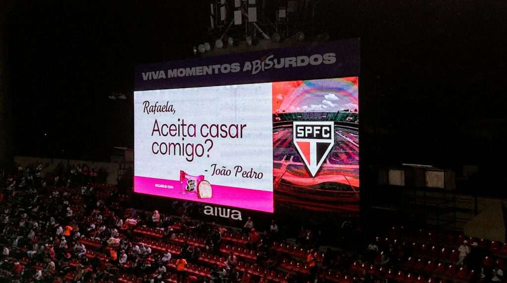 Durante o jogo entre São Paulo e Atlético-MG, o estádio Morumbis se transformou em palco de emoções além das arquibancadas. A marca Sonho de Valsa utilizou os telões e espaços de mídia do local para promover declarações de amor – ação que culminou em um pedido de casamento transmitido ao vivo para milhares de torcedores.