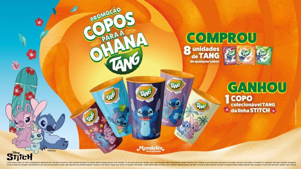 O nome da ação faz referência à palavra havaiana “ohana”, que significa família, um dos lemas mais lembrados da animação. Os copos trazem Stitch e Angel em diferentes poses e cenários, acompanhados da logo da Tang, reforçando a parceria entre a marca e a franquia.