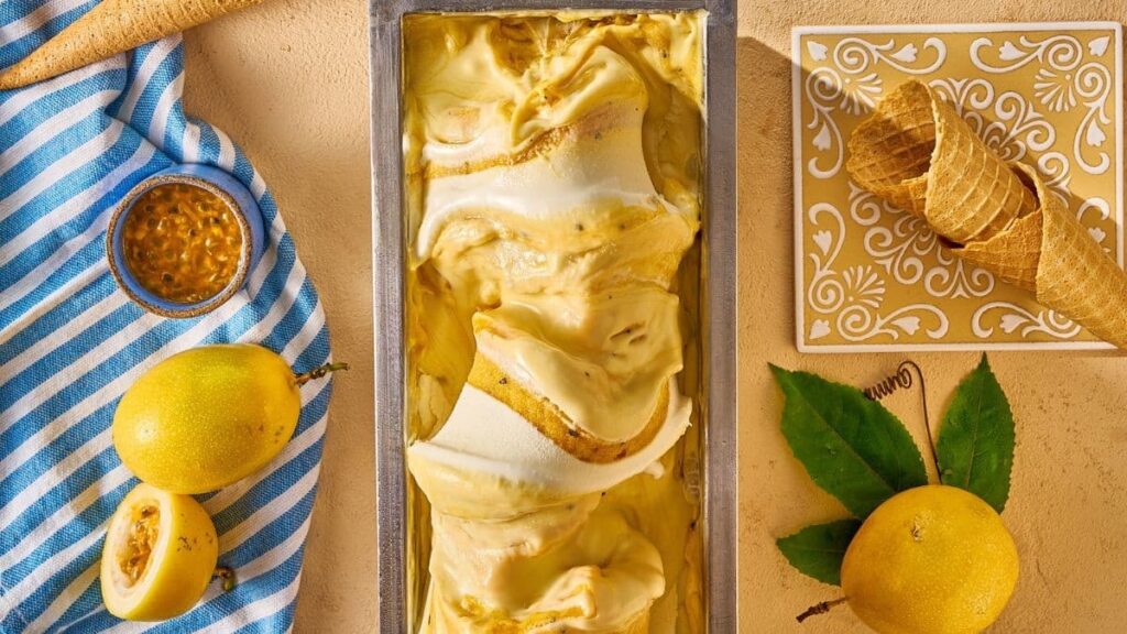 A proposta combina uma base cremosa de leite condensado com calda de leite e sorbet de maracujá. A ideia é equilibrar doçura e acidez, apostando em uma experiência mais leve e refrescante, alinhada ao consumo típico do verão.