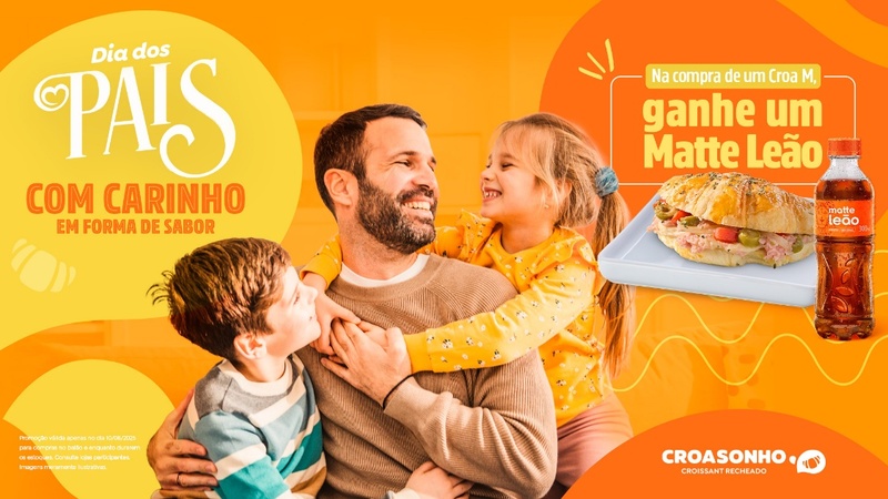 Nada melhor do que o companheirismo entre pai e filhos e dividir uma comida gostosa! No próximo Dia dos Pais, domingo (10), os papais terão um motivo a mais para curtirem um Croasonho com os filhos. A única rede de franquias especializada em croissants recheados do país vai presentear os clientes que comprarem um Croa, doce ou salgado, tamanho M, com um chá gelado Mate Leão, enquanto durarem os estoques, para vendas no balcão. A promoção não é cumulativa e não é possível trocar o sabor da cortesia. Confira a unidade mais próxima clicando aqui.