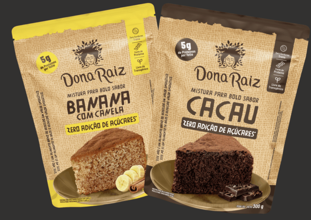 A Dona Raiz apresenta sua nova mistura para bolo 0 açúcar, disponível nos sabores Banana com Canela e Cacau. O diferencial do produto está na combinação dos sabores tradicionais da marca com uma formulação enriquecida em proteínas, sem adição de açúcares.