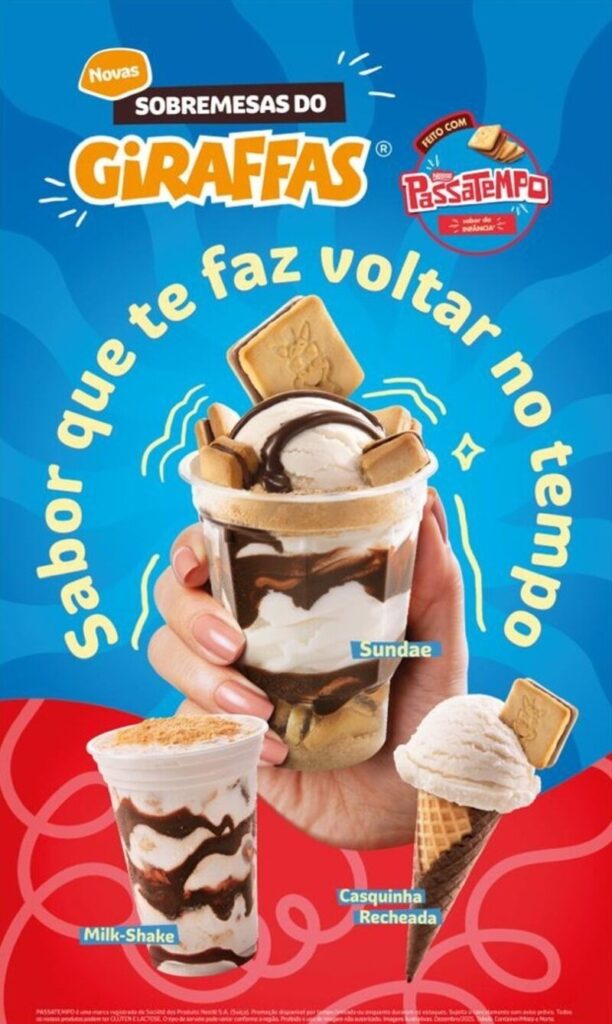 Desenvolvida para despertar nostalgia, a nova linha une sabor, memórias afetivas e uma experiência divertida para todas as idades. “O biscoito Passatempo faz parte da história emocional do brasileiro. A combinação desse gostinho nostálgico com as sobremesas do Giraffas traz, ao mesmo tempo, algo inovador e a oportunidade de reviver momentos especiais”, afirma Luciana Morais, diretora de Marketing e Trade do Giraffas.