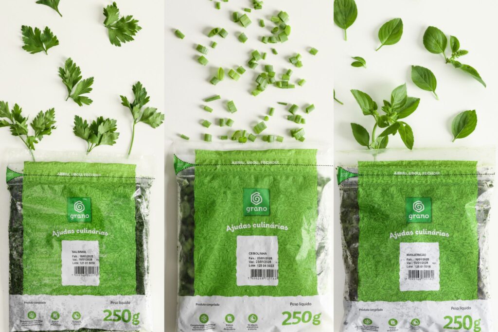Os ingredientes congelados da Grano Alimentos foram pensados para atender às principais demandas da rotina moderna. Com eles, o consumidor elimina etapas como lavar, descascar, picar e armazenar ingredientes perecíveis, reduzindo o tempo de preparo e a bagunça na cozinha. Além disso, o congelamento individual dos produtos garante que apenas a quantidade necessária seja utilizada, o que contribui para um uso mais consciente e praticamente zero desperdício, além de muita economia. Por exemplo, para se obter 250 gramas de salsinha in natura pronta para uso, seria necessário adquirir aproximadamente 3,2 maços, considerando as perdas decorrentes da limpeza e do descarte de partes não utilizadas. Em contrapartida, a mesma quantidade do produto congelado é obtida diretamente, já que ele oferece 100% de aproveitamento, eliminando etapas de preparo e desperdício.