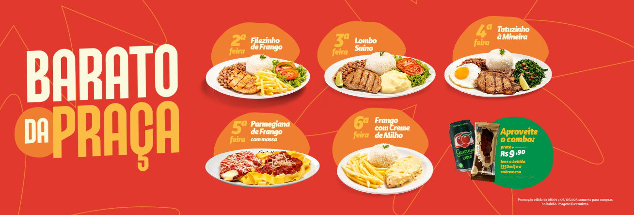 Desta vez, as opções disponíveis são: Filezinho de Frango, às segundas; Lombo Suíno, às terças; no meio da semana é a vez do Tutuzinho à Mineira; na quinta-feira, Parmegiana de Frango com massa; e, para fechar, o Frango com Creme de Milho. Todos podem vir com adicional de refrigerante lata e sobremesa por R$ 9,90.