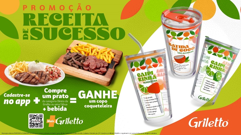 O Griletto, a maior rede de grelhados do Brasil, promove, até o dia 7 de setembro, a campanha “Receita de Sucesso”, aberta em 30 de julho. Neste período, no qual o Dia dos Pais será celebrado no domingo (10), clientes com cadastro no “Mais Griletto” (programa de fidelidade da marca) que comprarem um prato da categoria “Direto da Grelha” ou uma Tábua de porção, mais uma bebida, serão presenteados com um copo coqueteleira de 400ml. Cada um dos modelos vem com três receitas especiais de drinks brasileiros (dois alcoólicos e um sem álcool) impressas nos próprios copos, que são boas opções de presentes exclusivos aos papais nesta data especial.