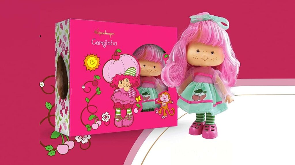 A escolha não é aleatória. A Cerejinha faz parte de uma geração de personagens que marcaram infância, vitrines e campanhas publicitárias. Produzida no Brasil pela Estrela a partir de 1984, a linha “Moranguinho e suas Amigas” se tornou fenômeno de vendas, consolidando a personagem como um ícone pop da época. O visual característico — cabelos em tons de rosa e bordô, sardas delicadas e vestido estampado de cerejas — permanece como símbolo de nostalgia para diferentes gerações.