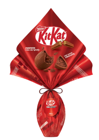O Ovo de Páscoa Nestlé® KitKat® Ao Leite (338,5g) traz o sabor icônico da marca em versão sazonal, combinando chocolate ao leite com pedaços crocantes de wafer. A proposta aposta no contraste entre cremosidade e crocância.