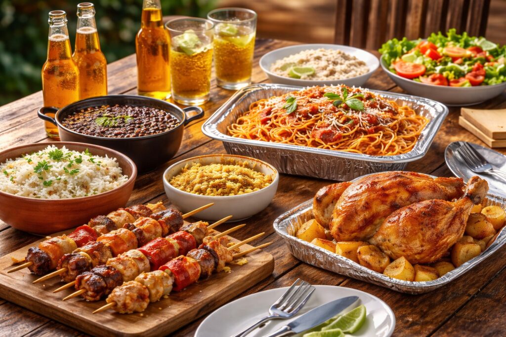 O frango de padaria continua sendo símbolo de domingo prático e familiar. A macarronada, muitas vezes servida com carne moída ou frango desfiado, segue como ritual de reunião. O arroz com feijão permanece absoluto. E o churrasco, seja na varanda, no quintal ou na laje, mantém seu espaço como celebração informal.